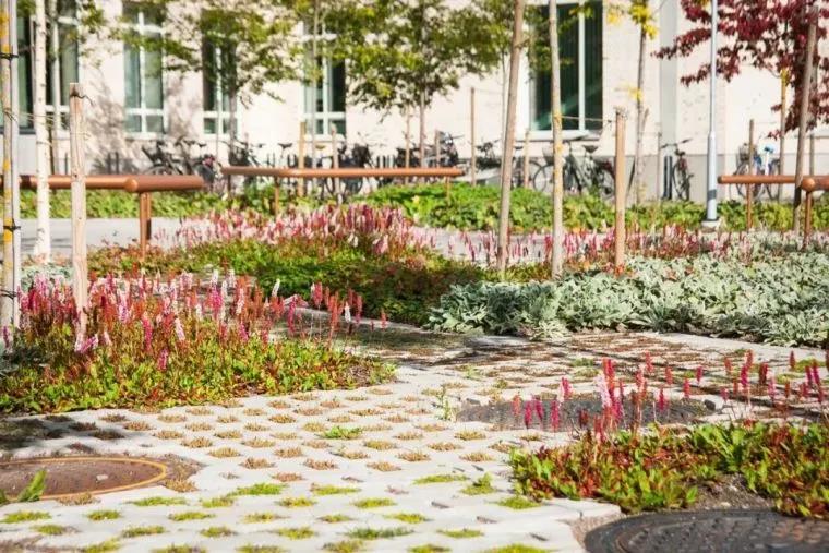 位于主入口處的植物園廣場種植了多種樹木,連同種植的鋪路路縫、戲謔的樹木和水等元素,共同構(gòu)成了