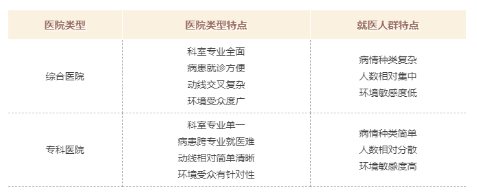 不同的醫(yī)院類型在就醫(yī)人群和醫(yī)院整體設(shè)計上有著不同的特征,但是由于運維管理、室內(nèi)設(shè)計等多方面的原因,很多患者出現(xiàn)在綜合醫(yī)院看病流程繁瑣、醫(yī)院環(huán)境惡劣的就醫(yī)體驗,而專科醫(yī)院雖然相對就醫(yī)環(huán)境較好,但高價格也給老百姓造成了心理壓力。