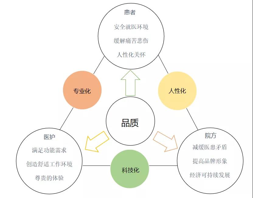 醫(yī)院的最終目的是為病人、家屬以及醫(yī)務(wù)人員提供更好的服務(wù)品質(zhì),好的醫(yī)院室內(nèi)設(shè)計必須具備“四化”,即專業(yè)化、人性化、科技化和尊貴化,主要通過公共空間和科室空間兩個大的方面來設(shè)計體現(xiàn)。