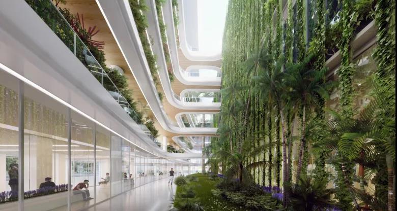 花園式醫(yī)院追求綠意盎然自然治愈,讓空間充滿生機和活力。主要通過內(nèi)裝設(shè)計來打造,可以采用局部綠植墻點綴空間,合理利用采光中庭及庭院,實現(xiàn)室內(nèi)室外借景,也可以局部植入綠植景觀小品,增強細(xì)節(jié)感。
