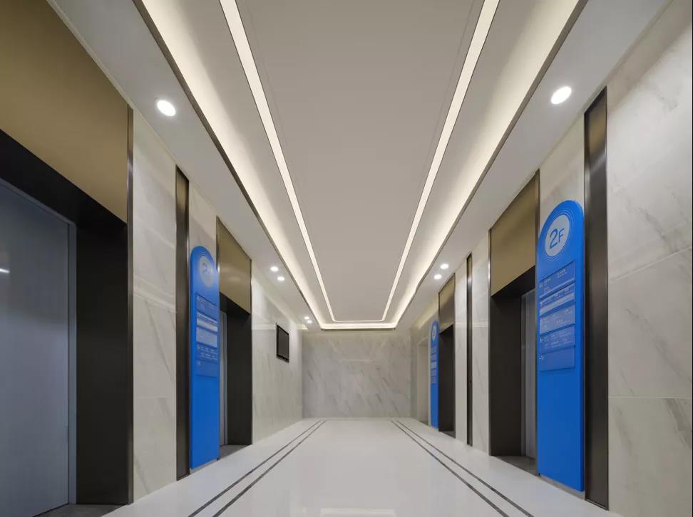 ▲ 圖45 人性化/專業(yè)化/尊貴化:醫(yī)技樓電梯廳采用易于引導(dǎo)標(biāo)識系統(tǒng)、防炫光暗藏?zé)艄狻⒉捎檬暮筒讳P鋼材質(zhì)品質(zhì),體現(xiàn)空間品質(zhì)感特性