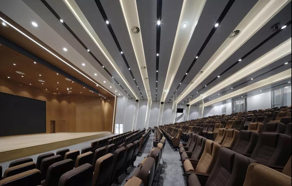 ▲ 圖51 專業(yè)化/尊貴化:綜合樓報告廳采用線性燈光氛圍、主舞臺采用木色色調(diào)