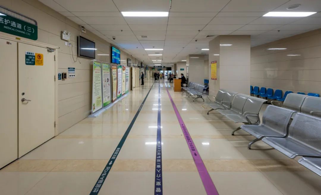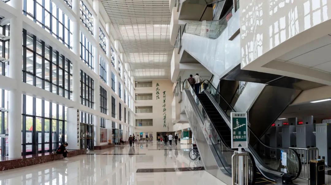 室內(nèi)的水平通道、垂直通道要從功能的分布、各醫(yī)療流程進(jìn)行梳理整合,選擇各種運(yùn)輸梯臺(tái)數(shù)量與形式,從而提高醫(yī)院的整體運(yùn)營(yíng)效率。圖為上海市第六人民醫(yī)院門診醫(yī)技樓垂直電梯廳。